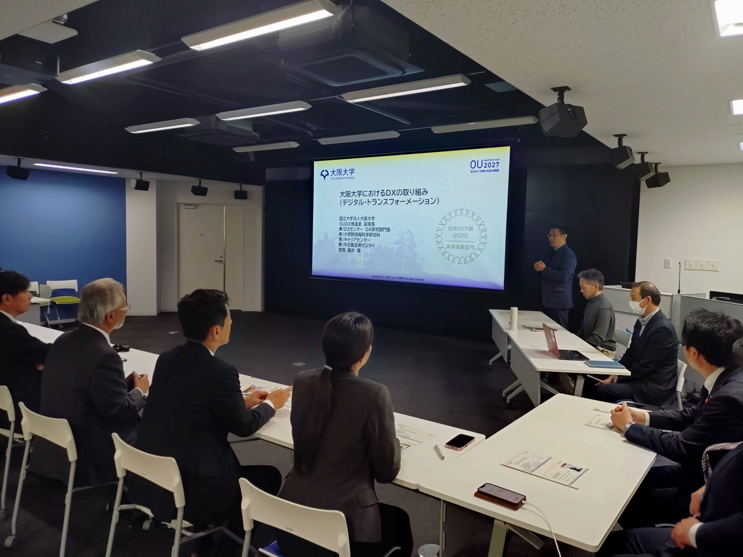 本学からは、鎗水 徹OUDX推進室副室長・教授(兼D3センターDX研究部門長)、釜池 聡太D3センターDX 研究部門准教授、中村 太情報推進部デジタル戦略推進室長が参加し、まず鎗水教授から「大阪大学におけるDXの取り組み(デジタル・トランスフォーメーション)」と題した講演が行われました。