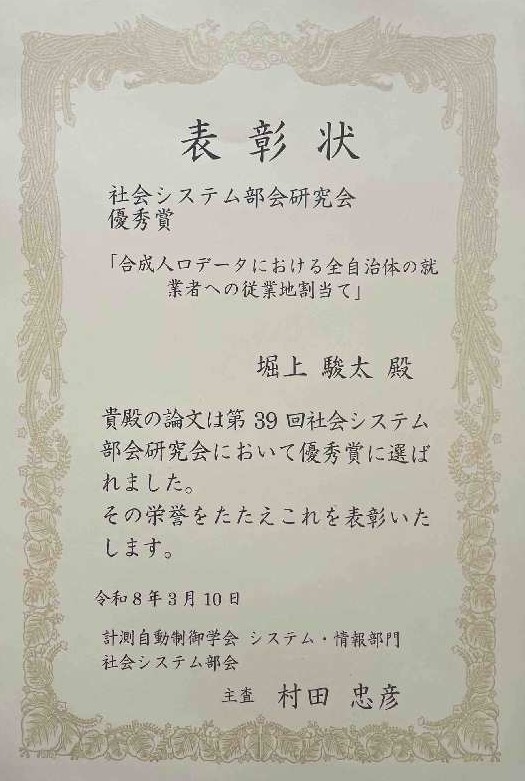 第39回計測自動制御学会社会システム部会研究会でデータ生成工学研究部門Synthetic Data Engineering Research Division所属の学生が優秀賞を受賞しました。