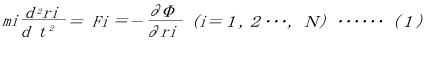 N個(一般的には数百~数百万個)について、それぞれニュートンの運動方程式(式(1))をたて、それを数値積分して解いていくことにより、瞬間瞬間における各原子の位置