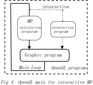 本論文でいう対話型シュミレーションは、人間が計算系に直接影響を与えることのできるシュミレーションとなる、ユーザがその時に必要な情報を与え、結果が必要なときには呈示し、その出した結果に対してさらに人間が変更を加えフィードバックするという、対話方式を目指している。この性質はリアルタイム処理かつグラフィックス表示を必須とする。図3に対話型MDシュミレーション流れを概念的に示す。ここでは詳しく述べられないが、具体的な計算プログラムはOpenGLライブラリの以下の性質を利用し、図4のように構成する。