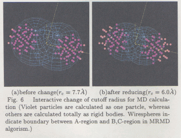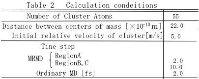 一例として行なった対話型MRMD計算の条件を表2に示す。現段階では画像表示に時間がかかるので、画像更新の間にしか対話が入れない現プログラムでは比較的少数の粒子(計110個)を扱うことが対話的シュミレーションの有効性を考察するには適当と判断した。