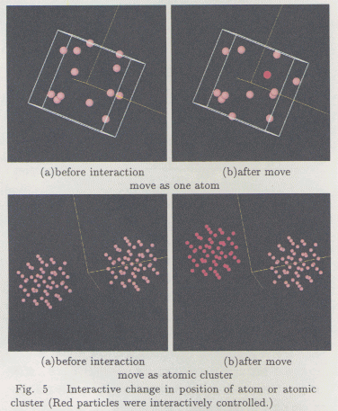 図5は、通常のMD計算中に原子および原子の集合体を対話的に移動している状況である。表示およびマウス移動が平面(2次元)に限られるので、3次元の視界変換を併用しながら思う場所に原子を動かす。クラスターとして動かすときには、中心を指定して適当な領域内の原子を認識させてから行なう。構造的に安定な状態で一つの原子を動かすと系全体にエネルギーが加わり、全体が振動し出したり劇的な構造変化が起こる場合もある。
