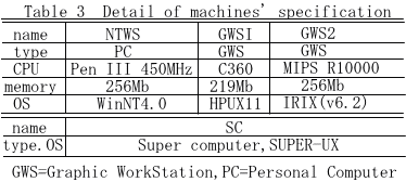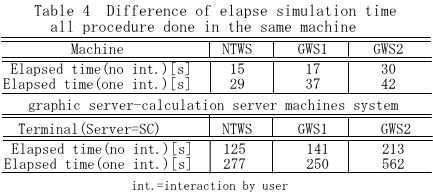 スパーコンピューター(SC)も含めて今回の研究で実行可能であった各計算機について、対話型シュミレーションの実行速度を考察した。各計算機のスペックを表3に示す。同じプログラムを次の2点、(1)25ステップ後にMD領域を変更(対話的割込みはこの1回のみ)、(2)ステップが50になったところで終了、を含んだ一定条件のもとで実行し、実行時間を測定する。実行にあたっては同じ計算機上で計算と表示をする場合と、SCで計算させ(X-window)端末上で表示する場合について比べた。結果を図4に示す。同じプログラムでも、計算機によってかなりシュミレーション速度が違う。現状では通信にかかる時間も多く、同一の計算機上でMD計算と表示を行なう場合のほうが良い実行速度を得られるが、大規模計算機になるとスパーコンピューターで行なわざるを得なくなり、表示は手元のグラフィックワークステーションもしくは画像処理能力の高いPCで行なう分業化も考えなくてはならない。