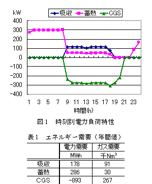 各システムの一日における電力消費(CGSは供給)パターンを図1に、年間のガス、電力需要を表1に示す。