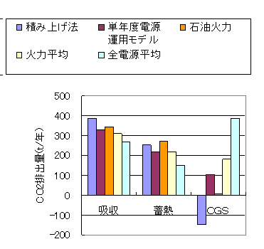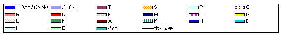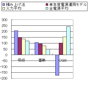 5)と揚水発電効率(68%)より算出した。この揚水発電効率は関西電力における揚水の発電量と動力値の年間値より算出した。積み上げ法では、各時刻の上端の火力発電所がマージナル電源である。また、単年度電源運用モデルによるマージナル電源は、図に示した各発電所の発電量と、新規の電力需要増分を加えた後に再び推定した各発電量との差より算出した。