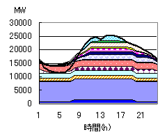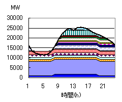 4)を参考に関西電力における電源別(火力は発電所別)の発電量を変数とし、各種制約条件のもと想定期間の総発電費用を線形計画法により最小化するものである。なお、この線形計画法の計算には、大阪大学サイバーメディアセンターのスーパーコンピュータSX-5(NEC製)のNAGアプリケーションを用いた。