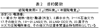 目的関数は表2に示すように、発電に要する年間ランニングコスト(燃料費)とする。電源は7種類を想定するが、火力発電については発電所ごとに区別し、27区分の発電所について計算を行う。また、一般水力発電は外生条件とすることで最適化計算から除外するが、揚水発電は積み上げ法とは異なり最適化計算に含まれる。計算期間は2000年度の1年間とする。