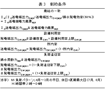 制約条件を表3に示す。需要と供給は26区分の需要パターンごとに日量で一致する。従って、揚水水力の蓄電・放電は一日の中で行われる。火力や原子力については負荷追従性も考慮した。