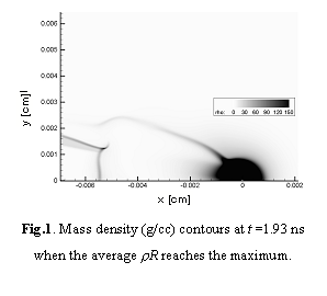 図1 は爆縮レーザー照射開始から1.93nsたった時点での密度の空間分布である。この時点で爆縮コアの平均面密度