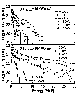| Fig.3 Momentarily energy spectrum of forward-directed fast electrons measured at the 100 ncr point every 100 [fs] from t = 500 to 1500 [fs]. (a) IL = 1019 W/cm² ,(b) IL = 1020W/cm². |