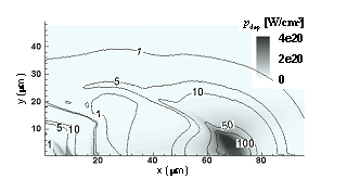 | Fig.4 Contours of heating rate by fast electrons , pdep [W/cm³] (color) and core density [g/cc] (line) when the core heating rate becomes maximum (t = 1300fs ) in the case of IL =1020W/cm². |