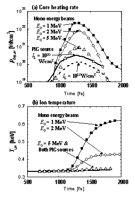 | Fig.5 Temporal profiles of (a) Core heating rate and (b) ion temperature averaged over the dense core region (p > 50g/cc). |