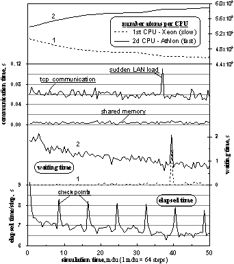 At the beginning of the (5)th period in Fig.4 the simulation program was recompiled for standard MPI environment on single node of SX-5 machine. It results in a pronounced reduction of CPU-dependent time. During the (6)th period in Fig.4, SX-5 works in exclusive usage mode. The waiting time becomes near ~20% of the CPU time/step and can not be decreased further. Most probably the number of CPUs is too small to optimize the MP sizes in the frame of Voronoi decomposition.