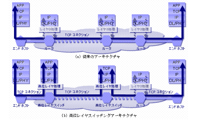 (Content Distribution Network) もそのような機構を実現するものと見ることもできる。しかし、本研究では、そのような特殊なサーバの介在を前提とするのではなく、ルータの付加機能として実現するところが新しい。これは、次項に述べる「ネットワークのスケーラビリティの確保」とも関係するものであり、サーバの介在を許さないことによって初めて実現が可能になるものである。図1に、従来のアーキテクチャと、本提案プロジェクトにおける高位レイヤスイッチングアーキテクチャの比較を示す。
