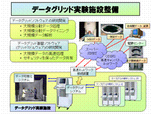 2003年1月、サイバーメディアセンター吹田地区を中心にデータグリッド基盤システムが整備された。データグリッド基盤システムは、本センターが中心となって研究開発を行っているグリッドコンピューティング技術による共同研究環境の基盤として導入された。最近、様々な分野において理論研究者と実験・観測研究者が協力して1つの問題に取り組むという機運が高まっているが、現状ではお互いに離れた研究機関で得られたシミュレーションや実験などの大量のデータを共有し、容易に解析、可視化する環境の構築はなされていない。本システムでは、このような共同研究における要求を満たすために、大規模データの高速な解析処理やセキュリティを伴ったデータ共有、データの可視化をスムーズに行う機能を提供している。