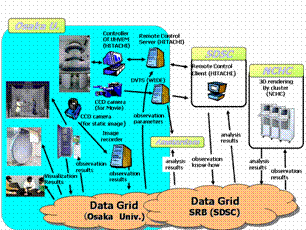 http://www.biogrid.jp/)、MEG、高電圧電子顕微鏡センター、高度光実験施設、天体望遠鏡など様々な分野の研究施設、実験・観測機器を接続し(図1、図2)、実験・観測機器の遠隔操作や、研究に必要な一連の解析、可視化作業を可能にするグリッドポータルの開発を行っていく予定である。