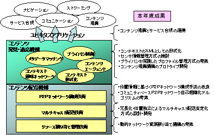 図1は、コンテンツアクセスメカニズムにおける研究要素と、本年度成果の概要を示している。