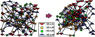 後者については、レスポンスの転送状況を監視し、転送頻度の高いレスポンスが存在する経路に関して論理ネットワークを繋ぎ換えるアルゴリズムを提案した。これにより、情報を要求するピアと、その情報を保持するピアを論理ネットワーク上の近傍に再配置され、トポロジが変化することを確認した(図3)。