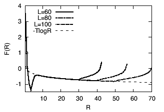 | 二個のタンパクの重心間距離を変数としたときの自由エネルギー。システムサイズを変えたものを重ね描きしてある。左の極小は凝集体に相当する。システムサイズが大きくなると解離状態(重心間距離大)の自由エネルギーが凝集体より低くなるが、サイズが小さければ、凝集体が自由エネルギー最小の熱力学的安定状態である。 |
