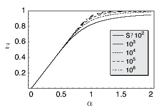 のベキ指数α と、種数(S) 面積(A) 関係 のベキ指数z の関係。指数z は、A が増大したときのS の「増大速度」に関係する。S が大きい極限では、Zipf の法則に対応するα = 1で折れ曲がり、特異的となる。さらに、α = 1 は、S の増大する「加速度」を最大にする点となる。 |