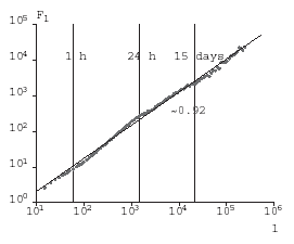 名神高速道路、瀬田東インター付近での流量ゆらぎのDFA による解析。ゆらぎが1/f スペクトルなら直線の傾きが1 になる