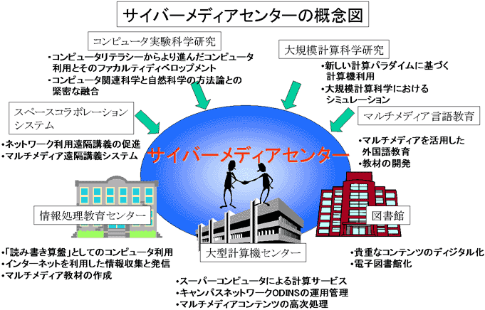 言い換えれば、本センターは、高度な科学技術用計算機および通信メディアを提供してきた旧大型計算機センター、情報処理に関する教育を推進する旧情報処理教育センター、情報コンテンツ発信を担う図書館の一部を総合化し、学内のさまざまな機関との連携により、これらの組織が従来から担ってきた業務に加えて、先端科学研究の支援、マルチメディア言語教育やSCS遠隔教育をはじめとする高度教育の支援などの役割を果たすことを目指します。そのことにより、情報メディア(データ)そのもの、ハードウェア、ソフトウェア、通信メディアなどの多様なメディアを基盤とした、新たな思想、発見、創造を促し、知的活動の大規模化、グローバル化を促すサイバースペースおよびサイバーソサイエティの構築を目指します。。ここに「サイバーメディア」センターの名前の由来(つまり、サイバースペース、サイバーソサイエティなどの「サイバー」とマルチメディアの「メディア」を併せた名前)があります。