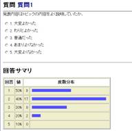 この章では、昨年度と今年度の人間科学部で使用されたWebCTの使い方を実例を交えながら、簡単に説明していきたいと思います。まず、図1は授業教材の閲覧の様子を示しています。ここではこれからどのようなことを学んでいくのかが明確になっています。図2は掲示板です。これは授業中に聞けなかった質問や教官からのお知らせなどを掲示するために利用されます。次の2つの機能についてですが、人間科学部の「情報活用基礎」では、学生をグループに分け、グループごとにあるテーマを与え、それについてプレゼンテーションを行ってもらうということをカリキュラムに取り入れています。そこで、発表グループ以外の学生にはそのプレゼンテーションを採点してもらうようにしています。こうすることで、採点者側はどのようなことに気をつければよいのかということの確認が行え、発表に対する質問などを考える練習になると考えます。採点はWebCTのアンケート機能を利用しており、図3がその画面を表しています。また、図4は採点された点数の集計結果です。この結果を発表者側は確認することによって、自分達の発表がどのようであったかを確認することができ、今後の発表についてのよい練習になると考えます。