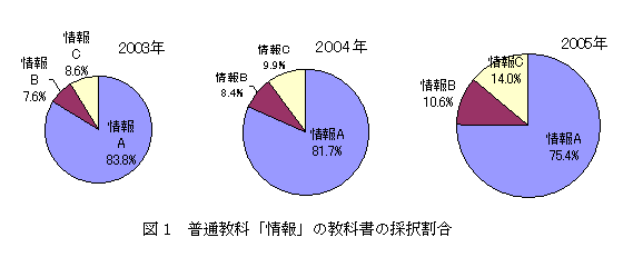 また、2003年度における検定教科書の採択割合は、図1に示すように、情報A、情報B、情報Cは、83.8%、7.6%、8.6%である。2004年度は、情報Aの採択割合が81.7%、2005年度は、情報Aの採択割合が75.4%に減少している。