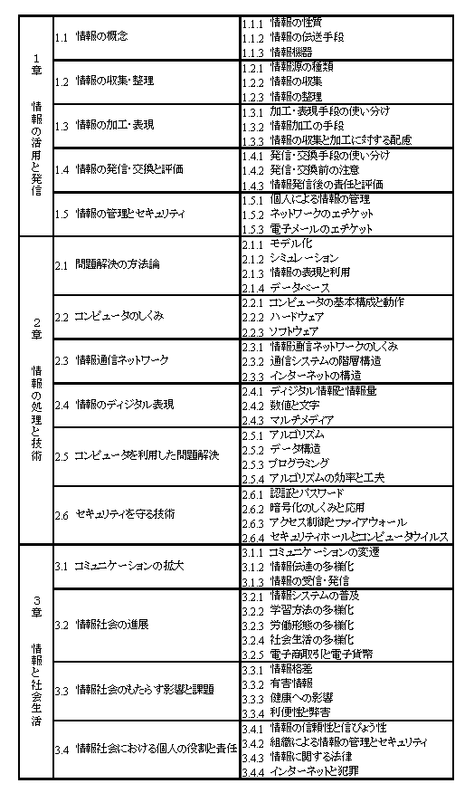 また、2006年度以降、大学における情報科目として、情報活用、情報の科学的理解、情報社会の理解に関する内容の共通の3科目(少なくとも6単位)が、開設されるべきである。ただし、一般教養科目、専門基礎科目とするかは、それぞれの大学で事情があるので、ここでは触れない。